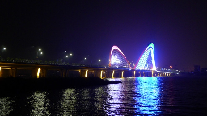工程主體為主橋、東引橋、西引橋三大部分。主橋?yàn)?0米+108米+30米三跨連續(xù)外傾式四索面下承式鋼箱系桿拱橋,以對稱傾斜拱結(jié)構(gòu)與橋外伸出的半圓人行道相對,寓意“張開雙臂,擁抱藍(lán)天”,也預(yù)示南昌市美好的未來與日同輝。工程總投資約5.98億元。工程于2010年5月7日開工,于2011年9月9日竣工通車。